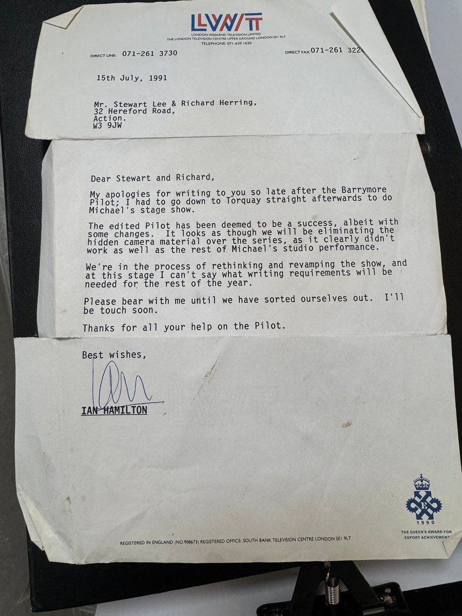 I had a bit of time to try and tidy up the office today. I'd so far avoided opening up many of my box files, for fear that I'd get lost in nostalgia, but a letter from LWT had slipped out of the folder. It was from producer Ian Hamilton who had been in charge of a pilot for Michael Barrymore that Stewart and I had improbably been involved with.