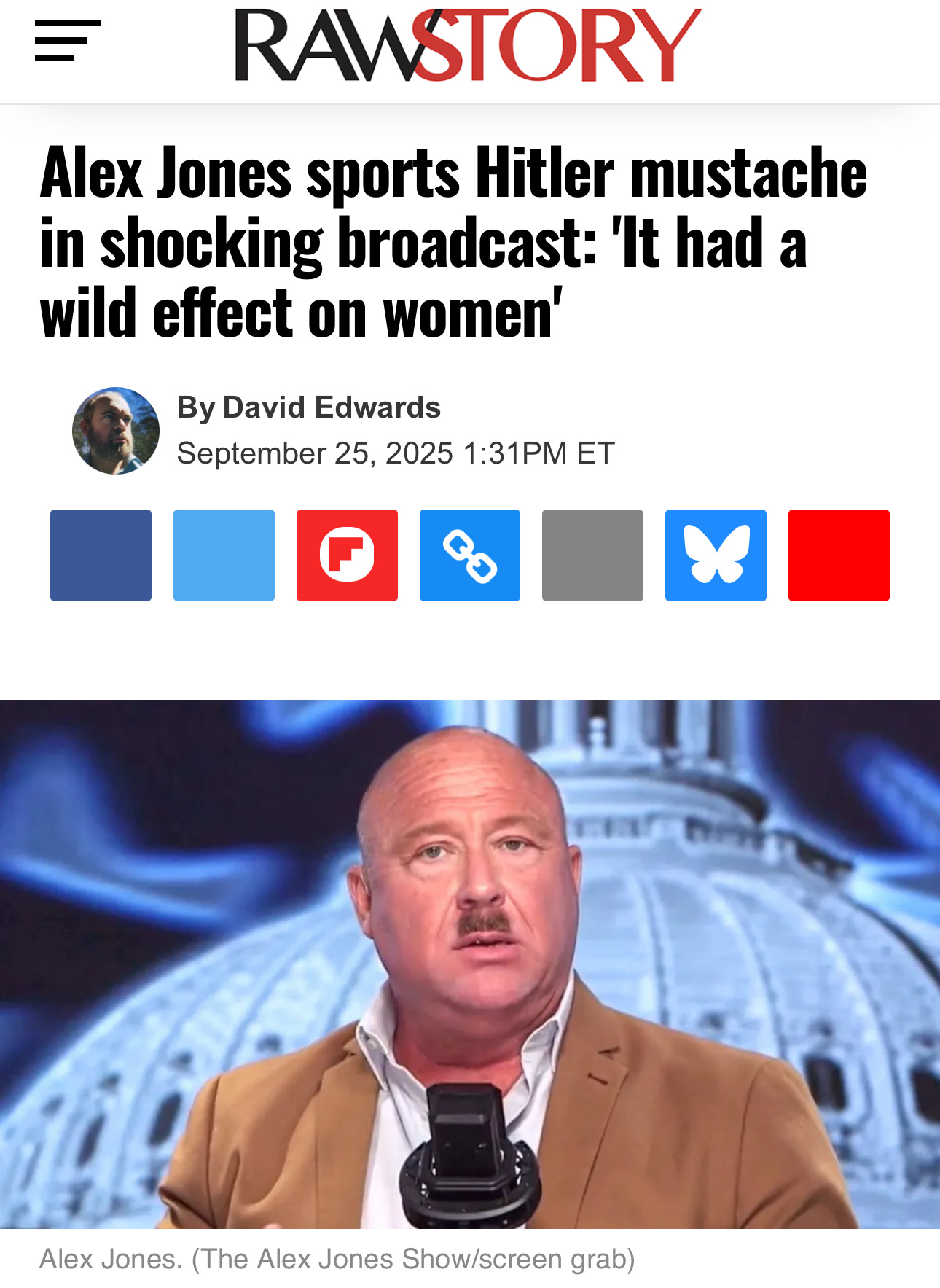 A few of you got in touch to let me know that renowned liar Alex Jones has got a Hitler Moustache. It’s always flattering when someone you respect is influenced by something you’ve done. But back to Alex Jones. You may recall that I once (or twice) grew a toothbrush moustache to reclaim it for comedy (cos Charlie Chaplin had it first and then Hitler came along and ruined it for everyone - it was probably the worst thing he ever did). Alex Jones is apparently attempting something similar, except maybe he’s trying to reclaim it for Hitler.