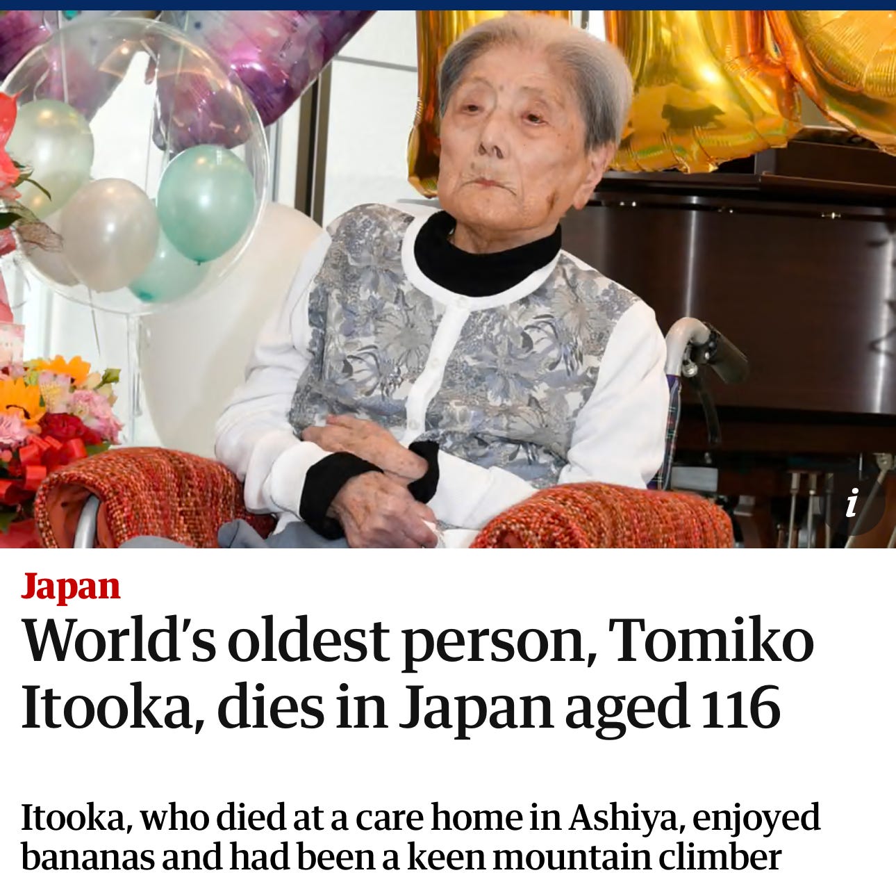 So soon after losing the oldest ever President of the USA. I can only reiterate that I hope I never get to be the oldest person in the world. It's an absolute death sentence. Please let's look after Inah Canabarro Lucas (who was only 16 days younger than Tomiko, so do keep an eye out). At least she gets a shot at the title. And Inah is a nun, so if she dies then that proves there's no God (and vice versa).