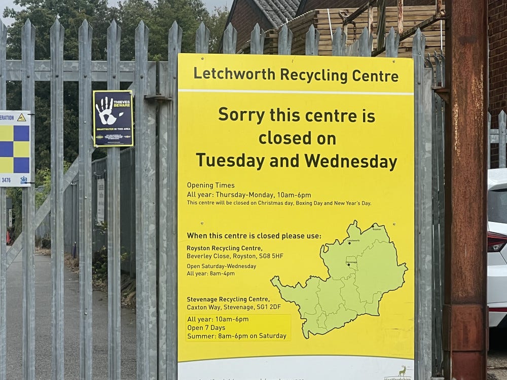 Down in the dumps this morning. Never has a saying been further off the mark. The dump is the happiest place on earth and I love everything about being there. I managed to haul a large love-seat armchair up the steps and tip it into the skip all on my own. I have never felt more manly. One car load of furniture and burned rugs and graffitied furniture (we let the kids decorate their own bedroom stuff if they wanted) disposed of. What a perfect start to the day. I wish I could come here every day, but it's closed on Tuesdays and Wednesdays and I only have a finite amount of stuff. Maybe I will set up a business dumping stiff for others, like a reverse Bagpuss. I wouldn't even charge.
