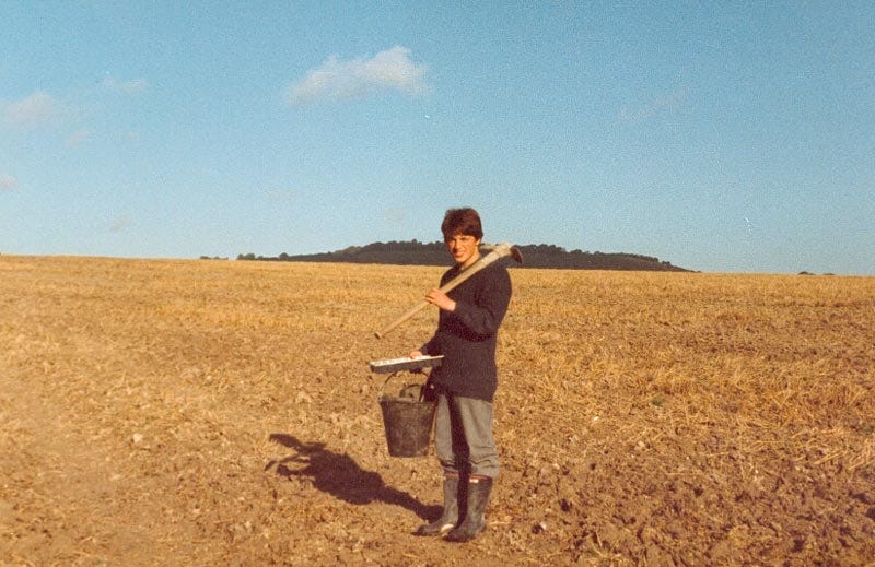 Mostly the play is based on the first dig that was in Hampshire, where it was gloriously sunny and we camped out in a field and drank in country pubs and ate potatoes that had fallen off the back of a truck trundling past. When I think of it, I think of this photo with me with a mattock over my shoulders, feeling happy, having fallen for one of the other people on the dig (who would eventually spend a fairly innocent night snogging me in her tent). I think I was only there for 3 or 4 weeks, but it was my first taste of time away from home and it occupies a bigger portion of my memory banks than it should. I was absolutely useless on the dig and as naive as it's possible for an 18 year old to be, but I earned £30 a week and that was enough to keep me in beer.
